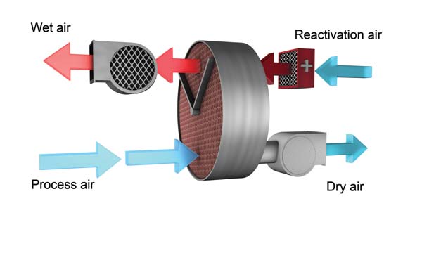 In a separate sector hot (reactivation) air is blown through the rotor to remove the accumulated moisture. The resulting wet air (which contains the removed moisture) is blown away outside.