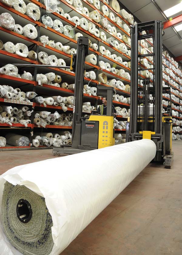 This busy and well-organised warehouse distributes to 14 Alliance depots across the country each day as well as direct to major retailers. Stock generally arrives during the morning and is put away in allocated racking areas using the reach trucks. As orders are received, carpet rolls are retrieved from storage areas and handled to the large automated cutting machine at one end of the warehouse. Cut carpet is rolled and wrapped before being handled, again by reach truck, to the appropriate order assembly “crib”, a designated deep racking bay, for each delivery route close to the loading bay. Assembled orders are loaded onto transport vehicles using the counterbalance trucks. The majority of distribution stock is in the warehouse for just two or three days.