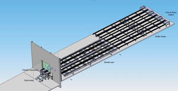 The intrinsic characteristic in the order is that all eight systems consist of complete twin shuttle cars with chain conveyor systems. Thus, the trucks can be loaded and unloaded without prior removal. Furthermore, behind every shuttle car three buffer tracks have been placed, whereby each system has a capacity of five truck loads. The picking and placing of loads from the buffer tracks takes place by means of AGV’s.