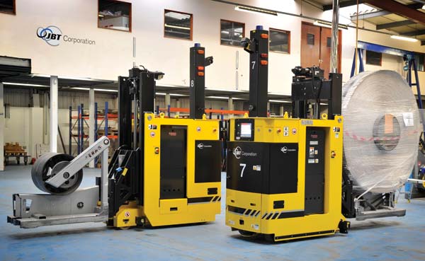 Ten AGVs were integrated by JBT Corporation into this printing customer’s operations. An on-board laser-based guidance system keeps the AGVs on the predetermined paths. The position of each AGV is also communicated to an on-site management control system so that operation of the fleet of AGVs can be continually optimized. Obstacle detection on the AGVs is supplied by additional laser based sensors which bring the AGV to a safe stop before it contacts any obstacle that might be in the AGV’s path. JBT Corporation’s laser guided AGV systems are very flexible and scalable and as the movement of materials in the printing plant grows and changes in the future, the AGV system can quickly be reconfigured and expanded to support the new requirements.