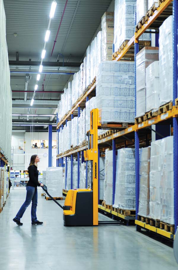 With the tiller in an upright position and the crawl speed button set, the truck can be manoeuvred safely and efficiently in the narrowest aisles and within confined warehouse spaces.