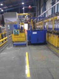 The unusual need for the fork lift trucks to travel down the transfer car aisle also presented an issue with our usual changing point protection safety guard rails, as installing this would prevent the trucks from accessing the aisle to the workshop. Instead we used our newly available instant drying UV line marking service to highlight the changing position when using the battery system and the Powerlogic transfer car. This fast drying paint was speedy, and achieved a very obvious alignment area, without interrupting travel along the aisle.
