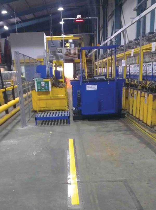 The Stone distribution centre approached us with a requirement for battery change within a very small area of a larger room that also supplies access for fork trucks into a workshop. The only route for the trucks would be down the same aisle as the transfer car, but a standard aisle would not have allowed the drivers enough clearance to safely manoeuvre the trucks.