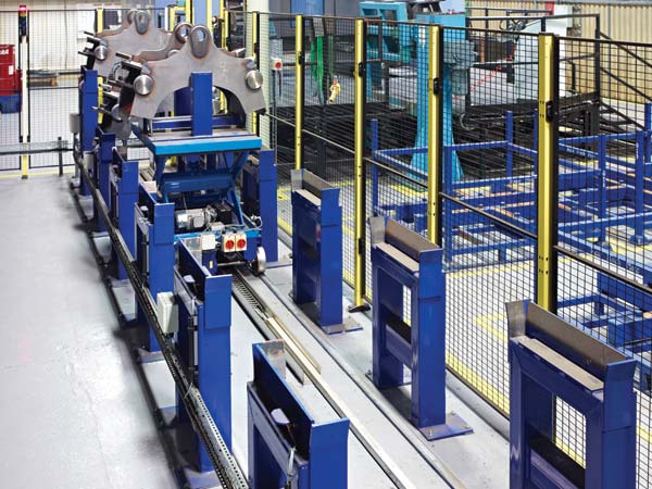 “The heavy steel product is loaded onto a transfer car at one end and indexed down the line station by station. At the end of the line it is lifted, via a scissor lift incorporated into the transfer car, onto a higher platform for the next process.