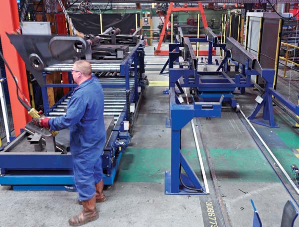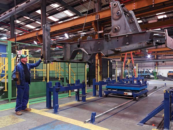 “The third solution they provided was for the side frames line and tower assembly sets. Here they designed two systems that mirrored each other to maintain a smooth flow of work. The side frames are automatically indexed forward to the next station via a transfer car, similar to the mainframe chassis. In this line, however, they have had to develop a system that takes the product through a 90-degree direction change in order to fit the system into the existing workflow.