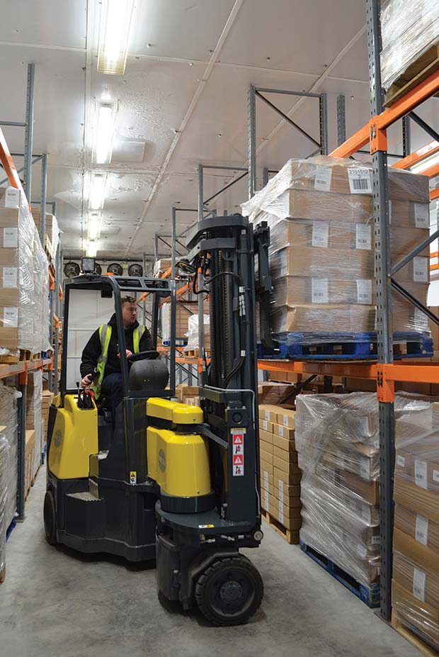 Compared to a reach truck, a good 30% extra storage space has been created by using the 20SE cold store spec Aisle-Master and of course hiring just the one forklift rather than two has also cut down on expenditure. Electric power means quick and easy charging, and the powerful 930 Ah batteries allow for lengthy operation in the harsh cold store environment.