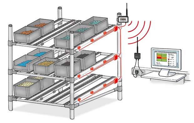 Sensors can be fitted simply and quickly to any FIFO flow racking system to detect the passage of all sizes of commonly used bins. Bin movements and the requests for replenishment are automatically transmitted wirelessly giving a transparency to the stock levels in the FIFO racks. This will enable a significant reduction in the requirement for safety stocks to be held there.