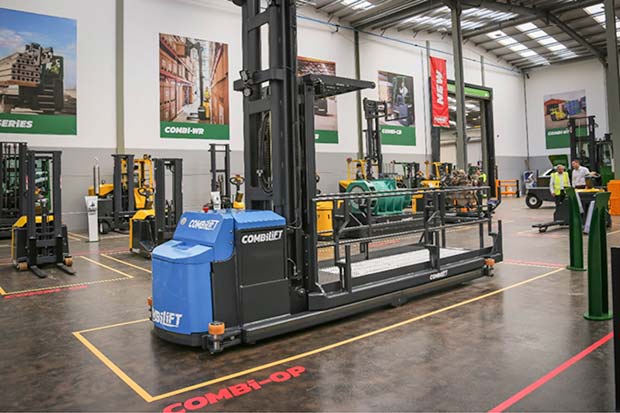 This man-up truck features a long platform to enable the operator to access long products stored at height. It is fitted with guide rollers to enable it to operate in existing guided narrow aisles of just 1.4m – the same width as those needed for Combilift’s GT truck. It enables operators to easily and safely hand pick orders for customers from the roomy elevated platform and it has a capacity of 450 kg. Its overhead guard, light anti-slip floor, self-closing platform gate and guard rails guarantee utmost safety, as does the travel speed and steering angle which automatically adjusts according to lift heights
