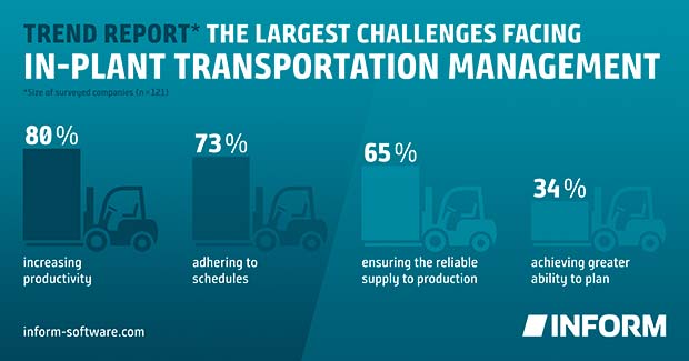 “76% of the 121 surveyed specialists and executives find in-plant transport jobs relevant or very relevant to the overall success of the company. Only 10% completely agreed that production is the core of the company and logistics are only a necessary secondary function. They consider increasing productivity (80%), adhering to schedules (73%) and ensuring the reliable supply to production (65%) as the largest challenges.