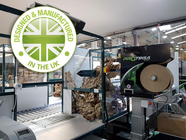 For example, 100% biodegradable and recyclable solutions, for speeding up a taping process, including no tape at all! Or a combination of Protega’s Hexcel equipment and stackable material on a packing bench that can save time and improve production, saving operators having to access large rolls of bubble wrap stored elsewhere on the floor. It’s also very flexible for different applications because it can spiral wrap wider products without the need for adhesive tape.