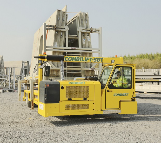 The development of the Combi-SBT was, in part, customer-led, as is the case for many of Combilift’s new products. A major manufacturer of precast concrete had designed its facility for high levels of production, but the amount of finished concrete being stored around the factory floor was slowing down production and reducing the safe workable area. They contacted Combilift to see if the company could come up with a solution for quicker removal of products that could lift the concrete from underneath and operate in narrow confines and the Combi-SBT was the result. Cycle times between casting have been reduced and workflow has increased to 50-70 batches per day at 24T each. The previous truck and trailer combination took two men about 15 minutes per load, whereas this is now a one-person job that takes as little as two minutes with the Combi-SBT which can be reversed under the swap body and quickly lift the product from ground to travel position. The 3-wheel design also enables easy operation on areas with compacted gravel where a perfectly level surface cannot be guaranteed.