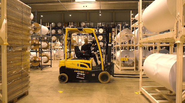 Manoeuvrable pallet trucks supply the lines with basic components such as film, glue and paper in the area-efficiently designed production. At the end of the line, suitable forklifts take over the sensitive goods, cut and wrapped, for internal transport to the warehouse. Industrial trucks maintain the steady flow until everything is packed and ready for dispatch.