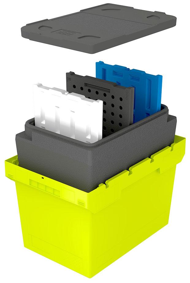 Features to make it an ideal shipment tote for online grocery shopping include dividers that prevent items from slipping, tipping and leaking and ensure bottles or cups remain in an upright position. Equally important are insulation inserts made of EPP to provide a variety of dry storage or lower temperature areas for fresh produce, dairy products or frozen foods. Thanks to these inserts, it is possible to create several temperature zones within the same container. This is an advantage for small orders with only a few items per temperature range. Being able to ship these orders within the same container reduces the number of containers per customer.