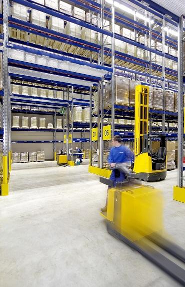 A high-rise narrow aisle structure will make good use of vertical capacity and efficient use of floor space. As a rule, narrow aisle facilities are serviced with man-operated stacker cranes or order picking trucks. This allows picking of smaller unit loads from all racking levels. Guide rails and inductive steering ensure that service vehicles always keep the ideal distance to the installation. Using VNA (Very Narrow Aisle) trucks, will allow aisle widths typically between 1.6 and 2 metres, and the trucks generally operate up to approximately 15 metres high. Going higher means broader trucks and therefore wider aisles. High bay automated warehouses served by stacker cranes can theoretically attain heights in excess of 40 metres, though just over 30 metres is more common. These generally create the highest density solutions.