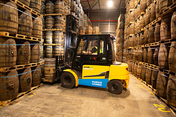 The larger 5-tonne models are used to locate casks within the site’s ageing cellars, which can hold more than 750,000 casks over many years of maturation. Due to the volatile vapour that can be given off during this process, known as the ‘Angel’s share’, the 50B-9 forklifts have all been specially prepared for distillery use, with specialist supplier Pyroban installing bespoke explosion protection kits.