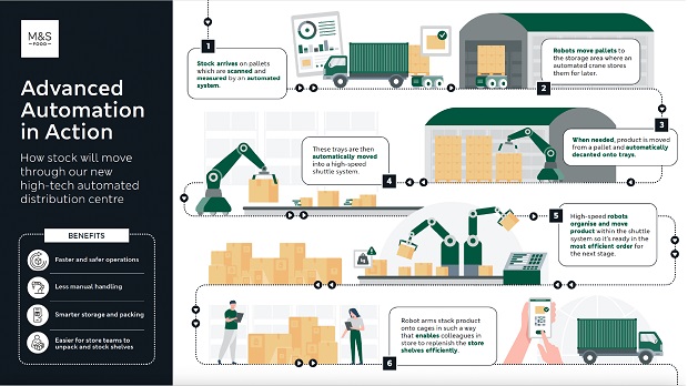 “We are delighted to be accompanying Marks & Spencer as a partner on their automation journey,” affirms Joel Garbutt, Chief Sales Officer for the Customer Unit North Europe at TGW Logistics. “Together, we have developed a solution that is geared to the future requirements of grocery retail and will set new standards in innovation and efficiency. TGW technology will enable and support the long-term growth of M&S Food.”
