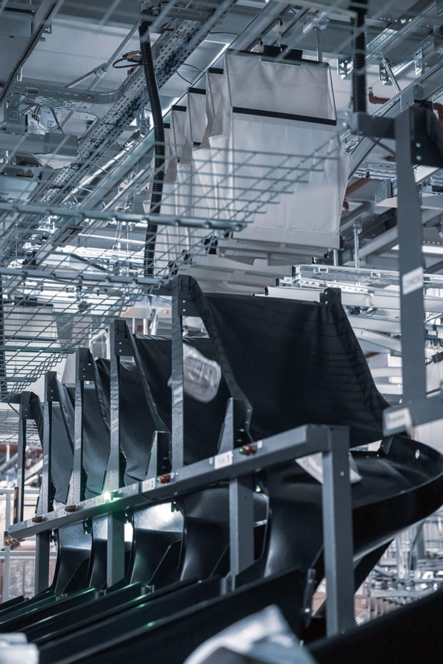 The AutoPocket system transports pockets with single-item orders directly to the packing stations, while those with goods from multi-line orders are sequenced by the system’s matrix sortation algorithm. In the order consolidation area, each of the two AutoPocket modules has 14 buffers across two levels, where pockets of individual items are stored temporarily until all parts of an order have been processed and consolidated. Completed orders are automatically diverted from the rotating buffer to the six packing loops by the warehouse control system. Here, the pockets release their contents automatically at one of 240 chutes, which slide them to 60 packing stations. Employees pack all the items in an order into a polybag and these parcels are then fed onto a conveyor that transports them to the outbound sortation system.