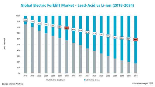 Our recently published Forklifts – 2025 report charts the meteoric rise of Li-ion forklifts and projects penetration rates will soar from approximately 32% in 2024 to over 70% by 2034 within the full-electric sector (which includes Li-ion and Lead-Acid models). A pivotal industry inflection point is expected around 2026, when Li-ion technology is forecast to surpass lead-acid batteries in market share within the electric forklift segment.